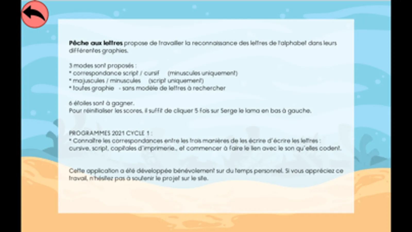 Pêche aux lettres propose de travailler la reconnaissance des lettres de l'alphabet dans leurs différentes graphies.