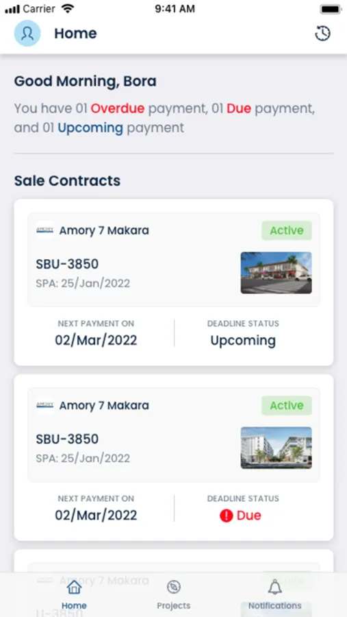 The app features the list of available properties with all the necessary details information of Amory 7Makara house types.