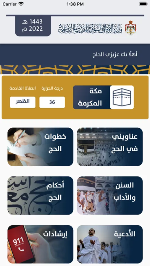 تطبيق الحاج الأردني مقدم من وزارة الأوقاف والشؤون والمقدسات الإسلامية لحجاج المملكة الردنية الهاشمية ولجميع الحجاج حول العالمن حيث يوفر لهم جميع ما يحتاجونه خلال سفرهم لأداء شعيرة الحج من الحكام الشرعية والأدعية والعناوين الجغرافية ومواقيت الصلاة.