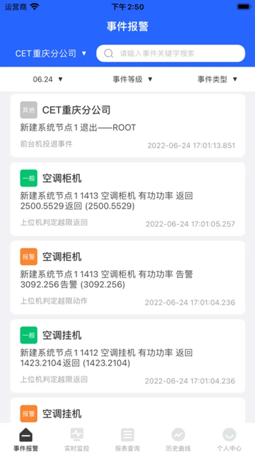 "e电管家"是CET研发的基于PecCore3.5平台产品的移动端应用,支持事件报警、实时监控、报表查询和历史曲线。