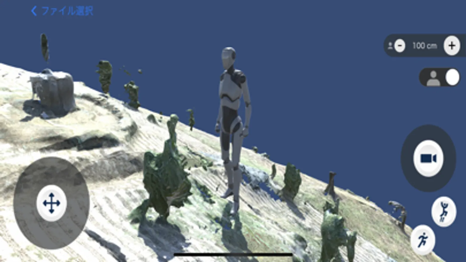 mapry3Dは、iPhone12 Pro, iPhone12 Pro Max, IPad Pro(第2世代)11インチディスプレイまたはiPad Pro(第4世代)12.9インチディスプレイ以降の端末で、OBJ形式の3Dファイルを表示することができます。OBJファイルとMTLファイル,テクスチャファイルを指定し、読み込むことで3Dデータ化したマップ上をアバターが移動します。OBJファイルはPCで当アプリに保存することや、iOS標準ファイルアプリを利用することで読み込むことが可能になります。