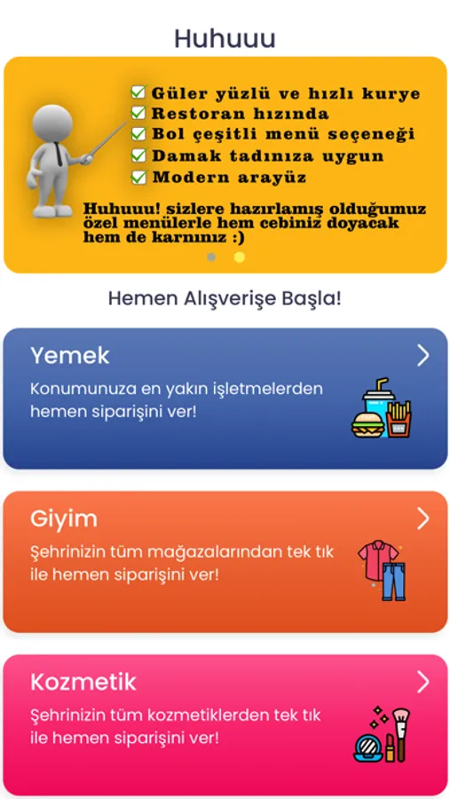 Yemek, giyim, kozmetik, takı ve aksesuar gibi çok çeşit sunan Huhuuu bu alanlarda "EN HIZLI TESLİMAT" sloganı adı altında mütevazi işletmelerle işbirliği yapıp sizlere dilediğiniz ürünü en hızlı bir şekilde kapınıza kadar getiriyor.