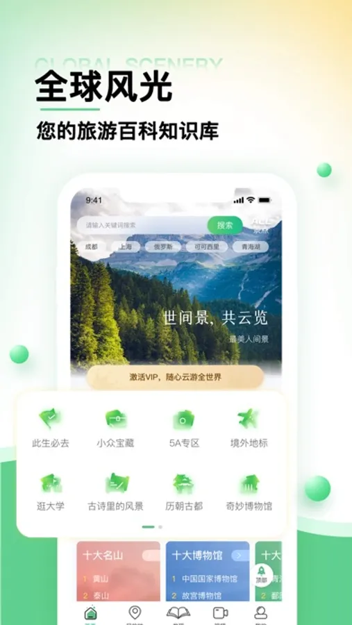 你是否梦想去游历祖国大好河山、看遍世界美景,却又迫于现实的无奈无法抵达?无需苦恼,《世界景点大全》来啦!景点大全是一款探索全球热门景点,了解各地人文风貌,制定完整旅游攻略的线上旅游软件,摆脱身体的禁锢,随时领略世界各地的风光,做你私人的口袋导游,旅游的好助手。读万卷书,云游万里路,一个app足不出户亦能云旅游,一部手机即可看世界。