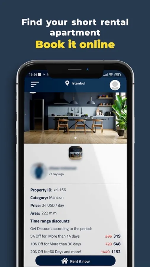 Find a daily rent apartment in Istanbul or any other town for your vacation or work trip. Book a unique flat for rent and finish your payment through the application.