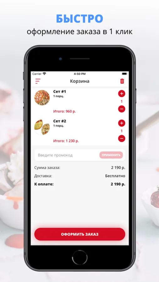 Скачивайте наше приложение, оформляйте заказ и наслаждайтесь любимой едой, где бы Вы ни были! Приятного аппетита!