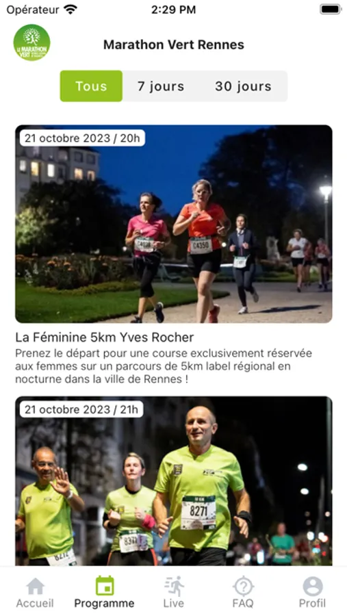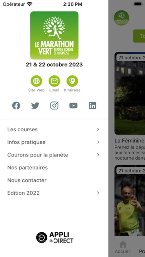 L’App Le Marathon Vert Rennes School of Business permet d’être au fait de toutes les actualités relatives à l’évènement, de consulter le Pass’sport de manière digitale et intuitive, et ainsi de préparer votre évènement. Vous serez notifiés de toutes informations indispensables pour réaliser votre Expérience Coureur.