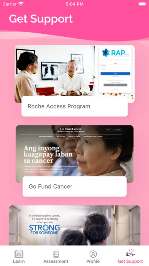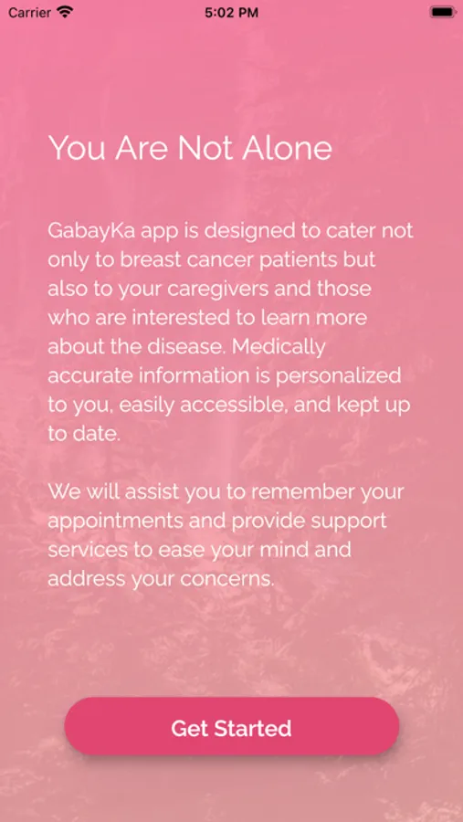 The GabayKa app is designed to provide basic education on cancer, assist users to remember appointments and provide support services, to ease the user's mind and address cancer-related concerns. Clinically relevant information is personalized, easily accessible, and kept up to date. It also provides: