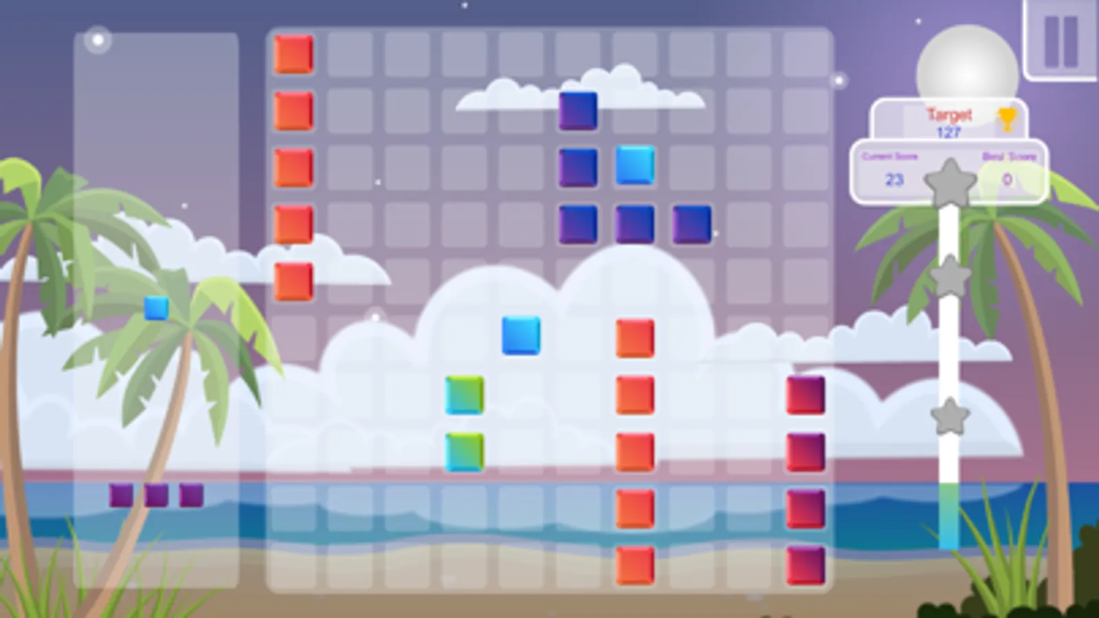 The first game is called Royal Blocks. Place blocks, clearing rows and columns to earn points, hit the score objetive to complete the stage.