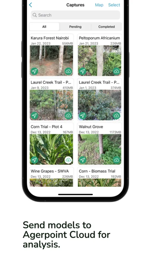 Upload models to the Agerpoint Cloud platform for more detailed modeling and measurements, including canopy size, trunk diameter, fruit count, disease presence, and species identification.