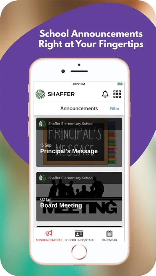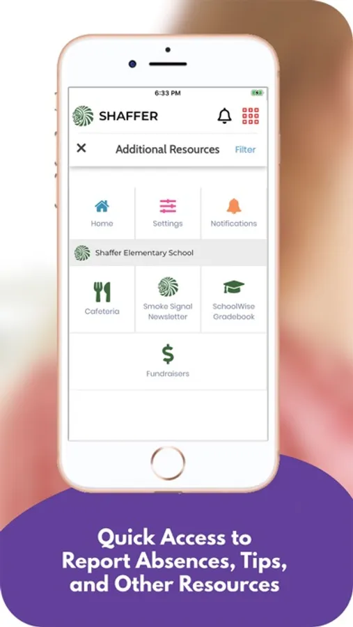 The app includes information for the district and all schools. Filter by the school your child attends to feature information for that school.