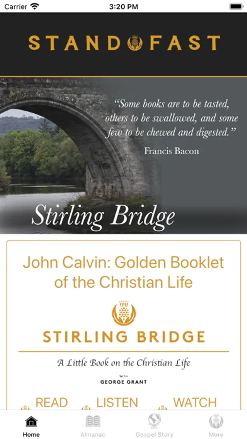 The StandFast App brings a wonderful array of historical, educational, literary, daily and Gospel global resources as it highlights through a rich digital experience the ministry of Dr. George Grant and the StandFast team. We are excited to provide this digital experience of covenant community and hope this will be a great blessing to you!