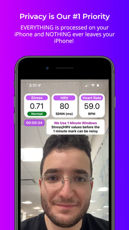 - Stress, HRV and pulse data is NEVER saved and NEVER leaves the phone! All processing happens on the phone and only inter-beat interval information for the last ~10 minute is kept in memory to produce stress, HRV and pulse readings. Any inter-beat interval information kept is immediately deleted once you stop monitoring!