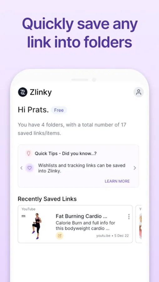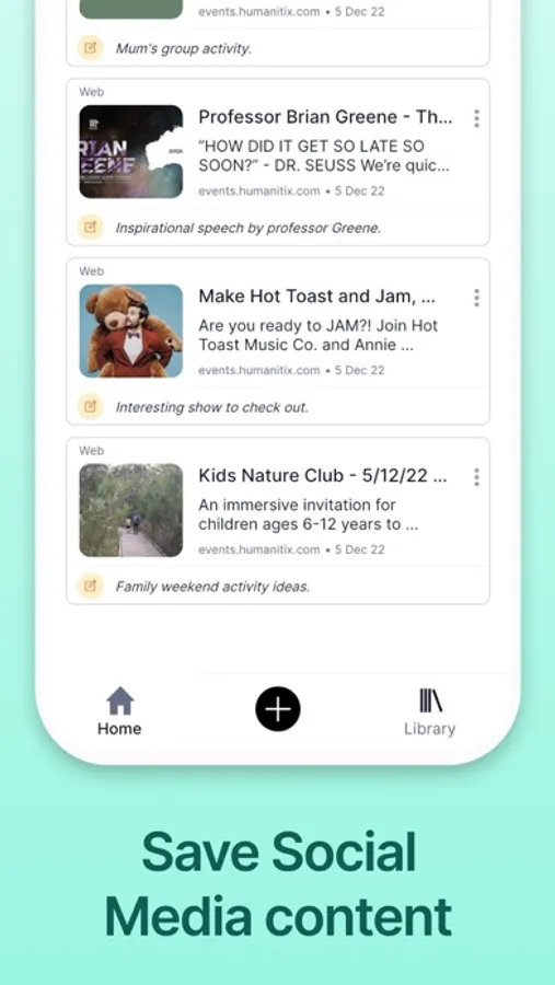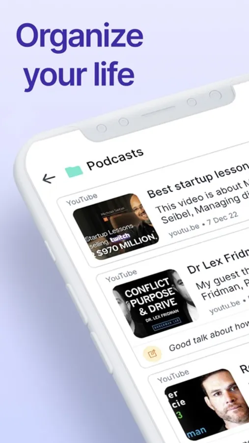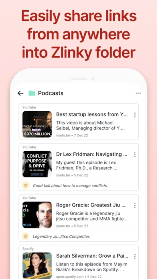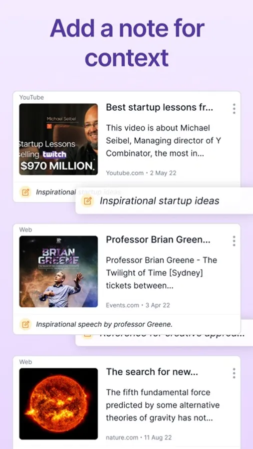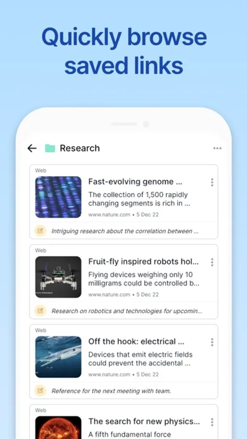 Easily save, and organize web and social media links into folders. There is an option to add a note for context when saving a link.