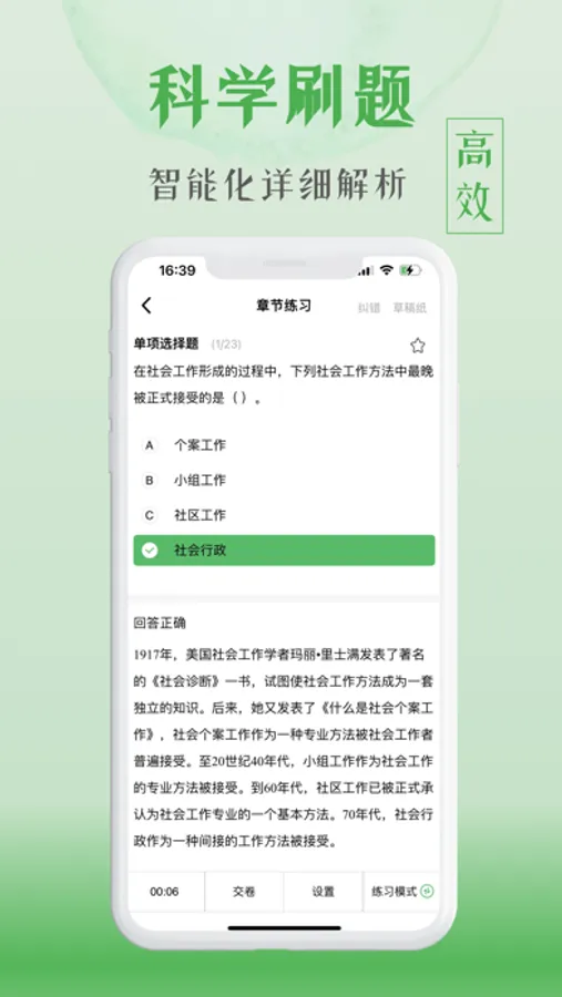 我们是一款随时随地可用的智能高效刷题软件。考生可通过设置备考目标,快速开启高效提分计划。同时我们拥有超大型在线题库,主要功能包括章节练习、随机练习、高频考题、历年真题,模拟考试等多种形式,让学生边学边练,达到进一步巩固学习效果的目的。在考前冲刺阶段还有考前模拟试题,帮助学员模拟实战,把握考试精髓,增加考试通过率。