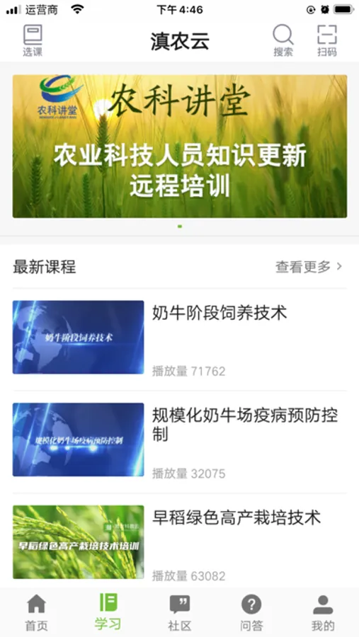 滇农云是定位于新型职业农民培育信息化、农技推广线上服务化的移动互联网平台。平台由云南省农委主导建设开发,提供的服务包括在线学习、农技问答、群组交流、专家社区,致力于作为新型职业农民培育及农技推广项目的线上有效补充。