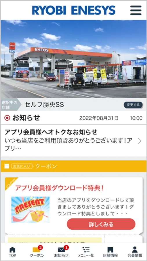 「両備エネシス」のダウンロード・ご利用は無料です。アプリダウンロード後にご希望の店舗をご登録の上、ご利用ください。