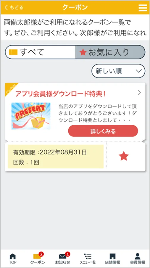 登録した店舗で実施中のキャンペーン情報や各種最新情報をお届けします。