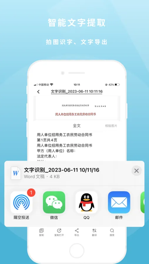 使用业内领先的高精度智能OCR识别技术,支持横版、竖版、手写、印刷等多种文字识别。识别速度快、准确度高