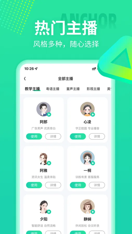 文字配音合成是一款专注于文字转语音的智能拟人配音app,采用强大的语音合成技术,打造简单高效的配音服务平台。拥有海量不同的主播,自然流畅,自动化合成,适用多种适用场景。更有众多真人广告促销成品录音,一键保存配音音频,满足您的配音需求。