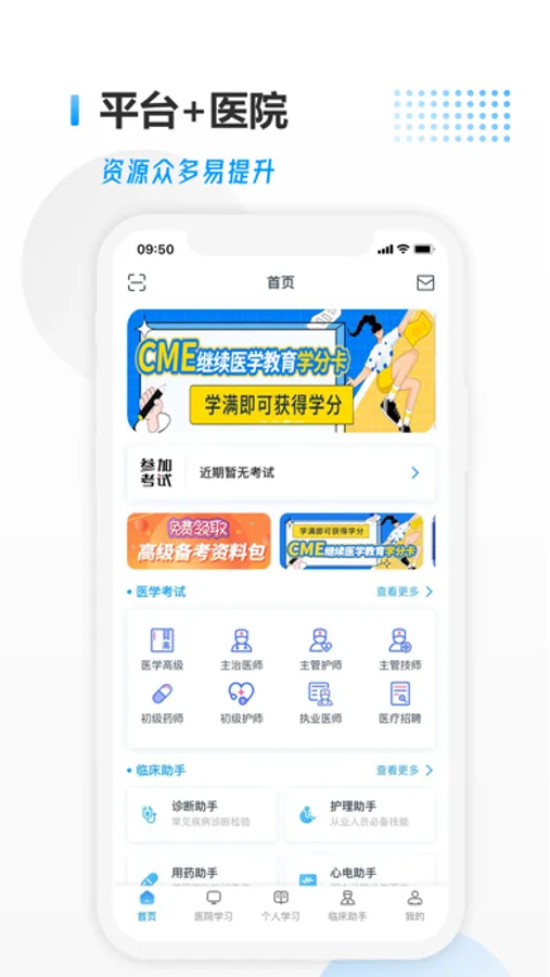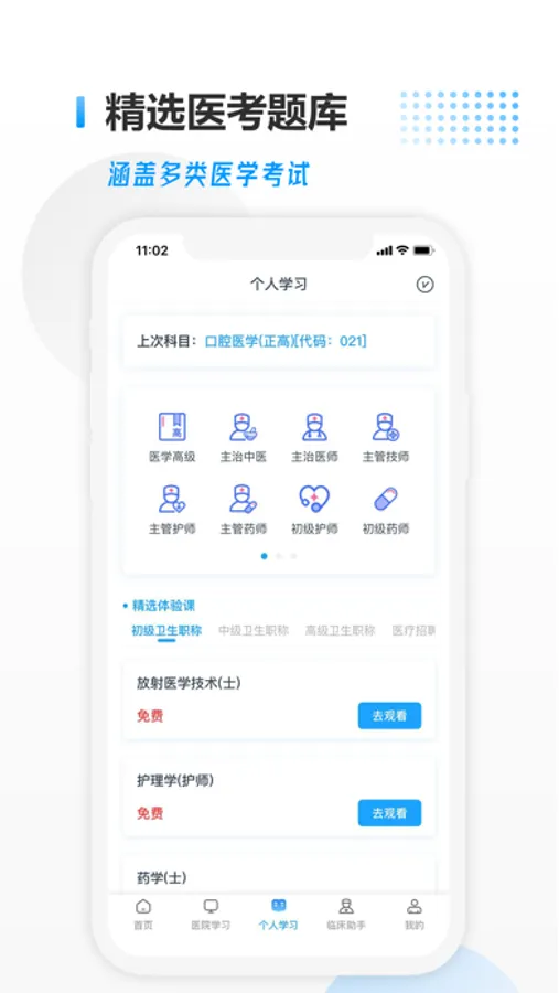 医考拉集学习、培训、考试为一体,涵盖医学中级职称、初级职称、高级职称、执业医师、执业护士、执业药师、住院医师、医疗招聘、医学三基、医学硕士、医学本科等全阶段医学考试题库;一级包含有用药指南、护理助手、心电助手等临床技能相关内容,医务人员不进可以用于职称备考复习及日常技能提升,同时还可完成医院下发的考试/练习,是医务人员考试学习的必备利器。