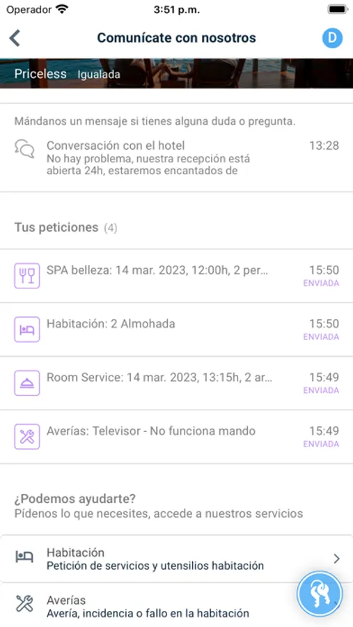 But that's not all, our application also allows you to communicate with the hotel easily and quickly. Do you need to order room service or make a query? Just open the app and send a message to the hotel staff. Forget having to call the front desk and wait to be served.