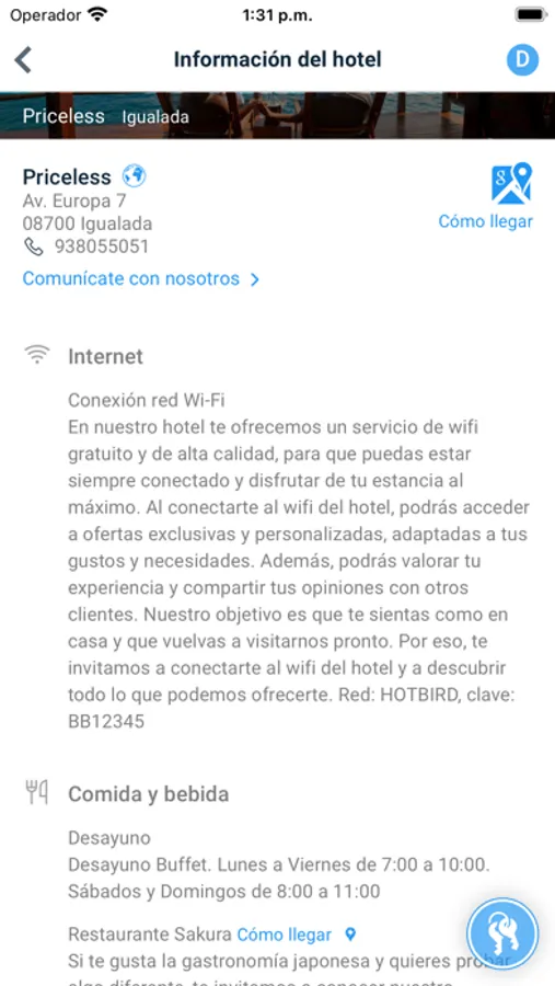 A més, amb la nostra aplicació també podràs accedir a informació important de l'hotel, com ara horaris de servei, activitats i esdeveniments, i recomanacions locals. Tot el que necessites saber està al palmell de la mà!