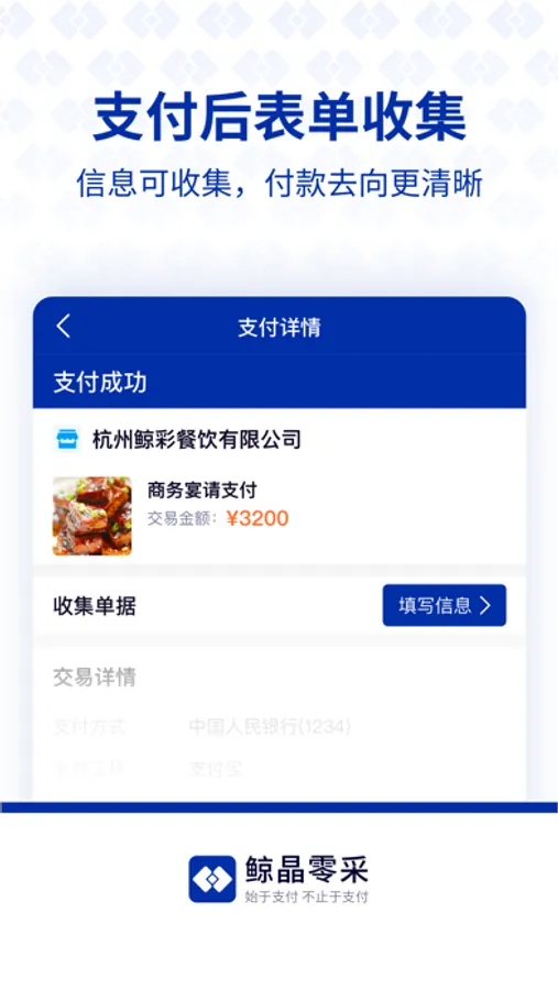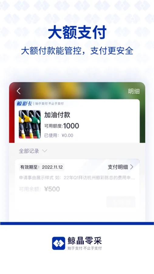 鲸晶零采是鲸彩时刻旗下的行业支付产品,专注于生鲜采买,零星采购,门店备用金等支付场景的支付解决方案。为企业提供一站式的场景设置,支付管理,额度控制,广域场景管控等支付能力。提高采购人员的支付效率,提升财务对资金的管控能力,保障交易的真实性,留存完整的支付交易数据,交易全程可追溯。
