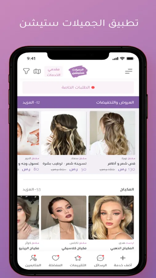 - تقديم خدمة تسجيل الخدمة لمزودي الخدمة من المنزل وأصحاب الصالونات والموديلات والشعر وتسريحات والصبغات والزيوت و التاتو لتصبحي من جميلات الوطن لعربي والأسعار والمواقع الخاصة بتوافر الخدمة.