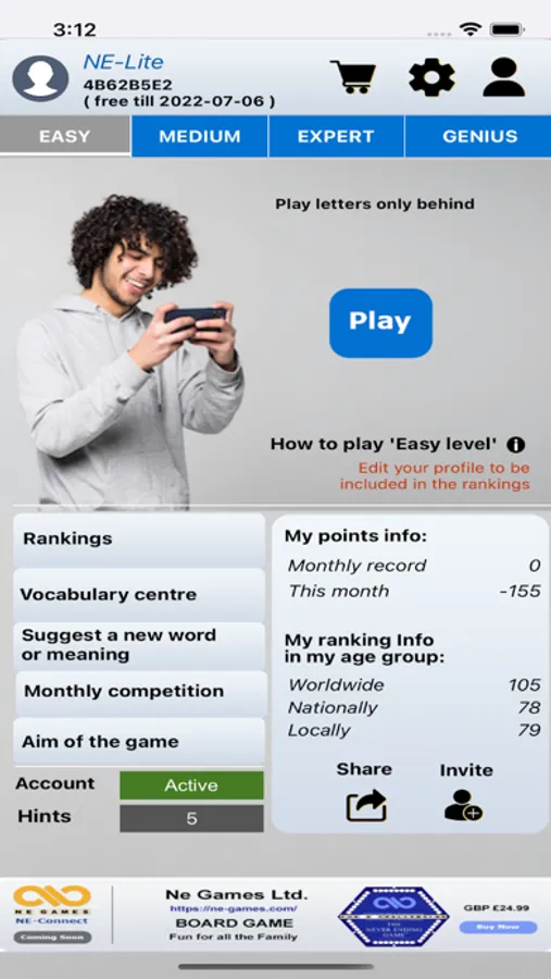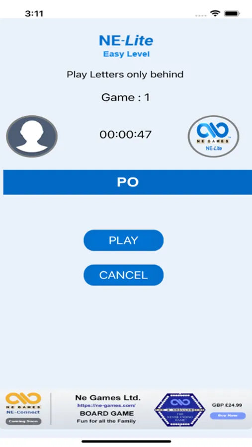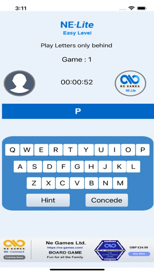 NE-Lite is the version of "The Never Ending Word Game" where you play solely against the computer and artificial intelligence. This word game is totally different in concept from any other word game you will have ever played before and challenges the mind in a completely different way, which makes it novel and refreshing to play. It's a fun game of skill that tests your knowledge of English vocabulary and spelling with four levels of difficulty. This makes the game equally fun and challenging for children from an early reading age, through teenagers to adults of any standard of English, all the way up to the very best word smiths.