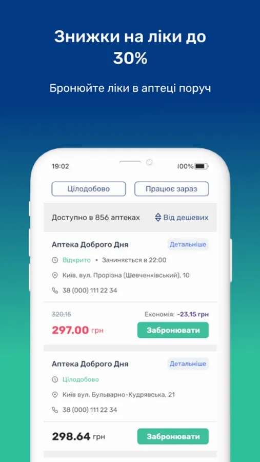2. Після вибору регіону для пошуку вам будуть показані всі пропозиції в аптеках поряд з Вами (від 100 метрів). Забронюйте препарати та заощаджуйте до 30%.