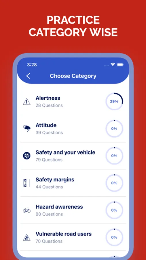 The app allows you to practice DVSA licensed revision questions and also allows you to keep track of your progress. Questions are divided into following categories: