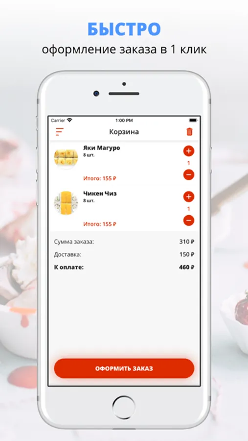 Скачивайте наше приложение, оформляйте заказ и наслаждайтесь любимой едой, где бы Вы ни были! Приятного аппетита!