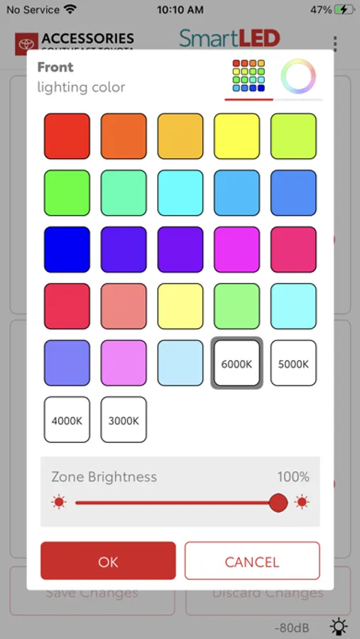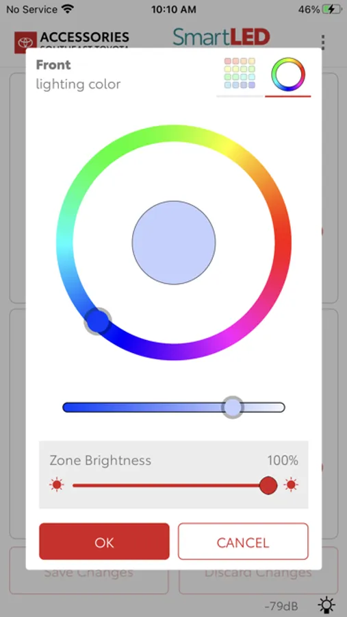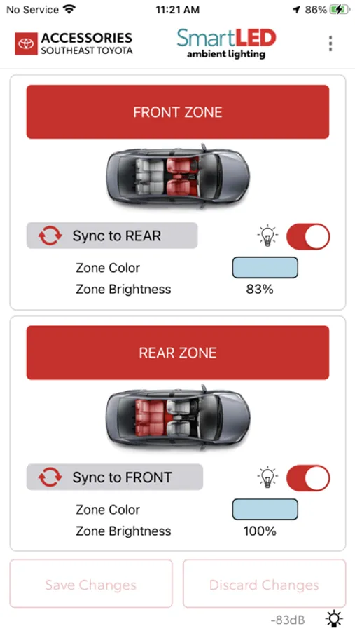 SmartLED Ambient Lighting is an essential tool to go along with Ambient Lighting product from SouthEast Toyota Accessories. Application is designed to allow users to select any color using a color wheel or preset swatches, as well as select desired brightness. Selections may be done for front and rear zones separately or synced together.