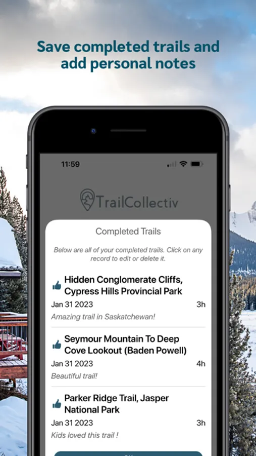 - Complete trails to keep track of number of trails, elevation, and distance (you’ve completed) in your profile!