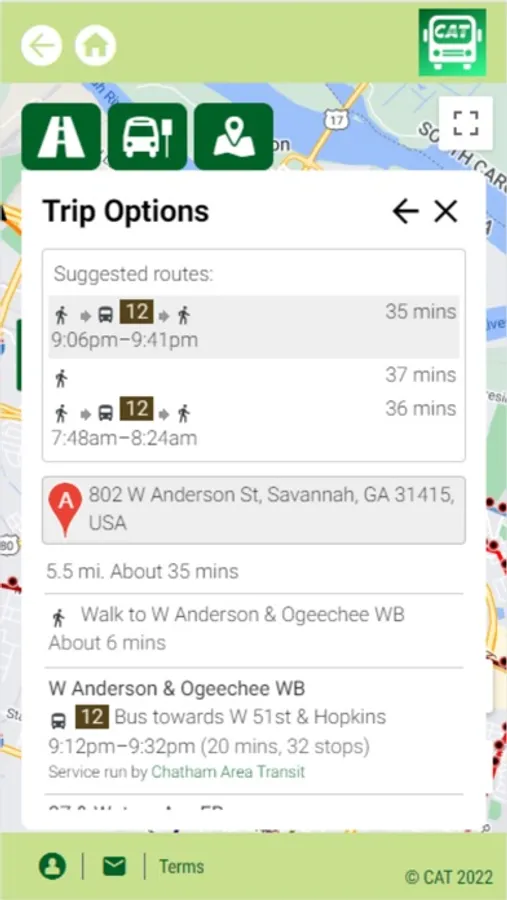 CAT Tracker, your source for real-time bus arrival information in Chatham County. Residents and visitors to now have real-time bus information at their fingertips. Track your bus, get bus arrival information, find nearby stops, find routes, and plan your trip from your mobile device! Save your favorite bus stop on the app to easily view stop arrival times. Subscribe to rider alerts and service detours and be informed before you start your journey. Set up text message alerts so you know when your bus is due. Click on the system map, select a route, and see where your bus is in real time. Enter your starting location and destination to access fast trip planning. Traveling with Chatham Area Transit has never been this easy!