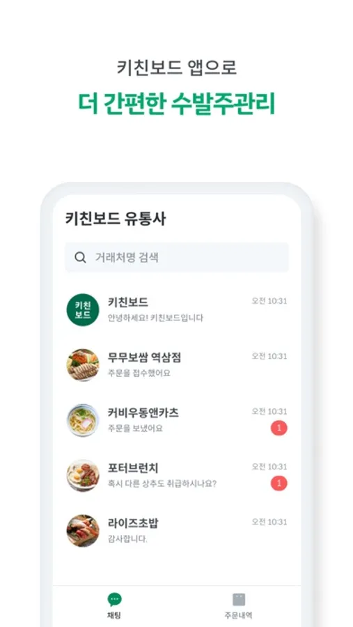 25,000개 매장 사장님들이 선택한 키친보드에서 사장님들과 실시간 채팅으로 대화하고 주문을 받아보세요.