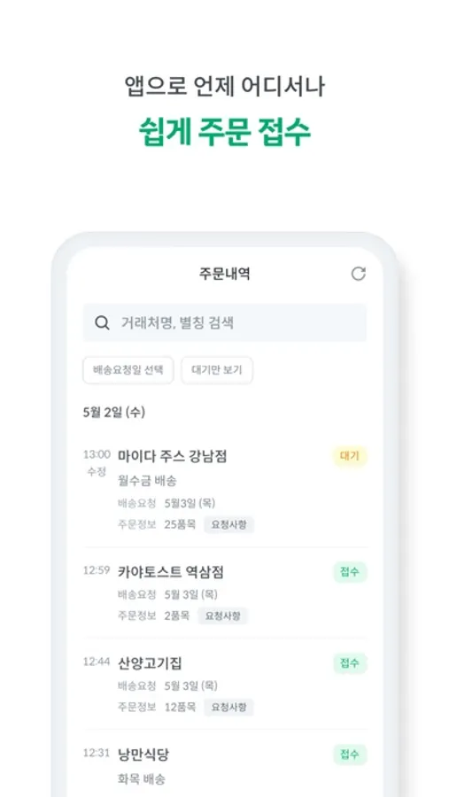 내 유통사를 이용하는 매장들의 주문을 하나의 앱으로 쉽게 관리하세요.