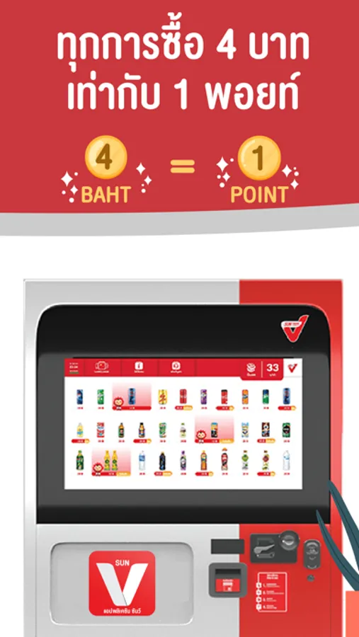 "SUN V" will help the customers enjoy shopping more at our vending machines by earning and burning SUN Points. The customers can earn SUN Points from buying items at our vending machines, in addition, they can use SUN Points to get special discount for buying items at our vending machines or to get rewards and other special promotions from Sun Vending.