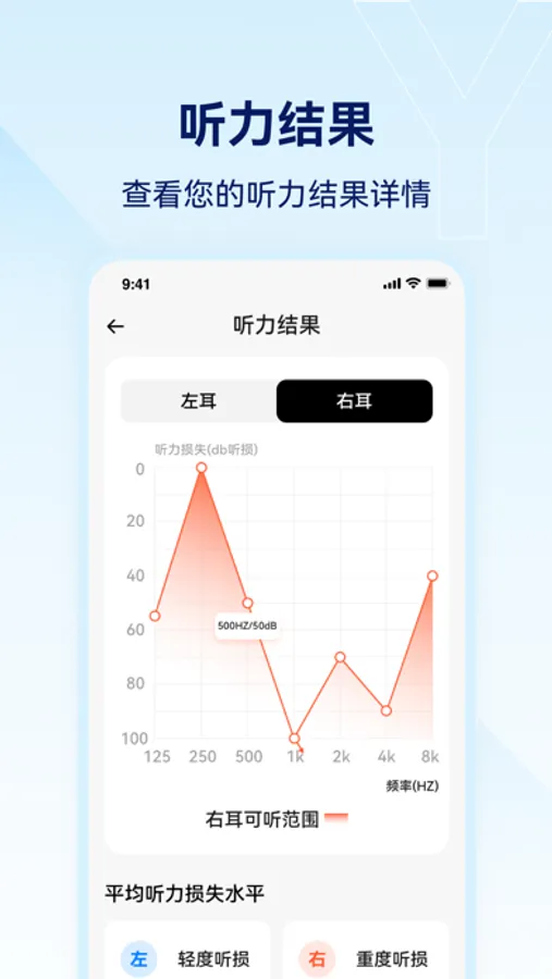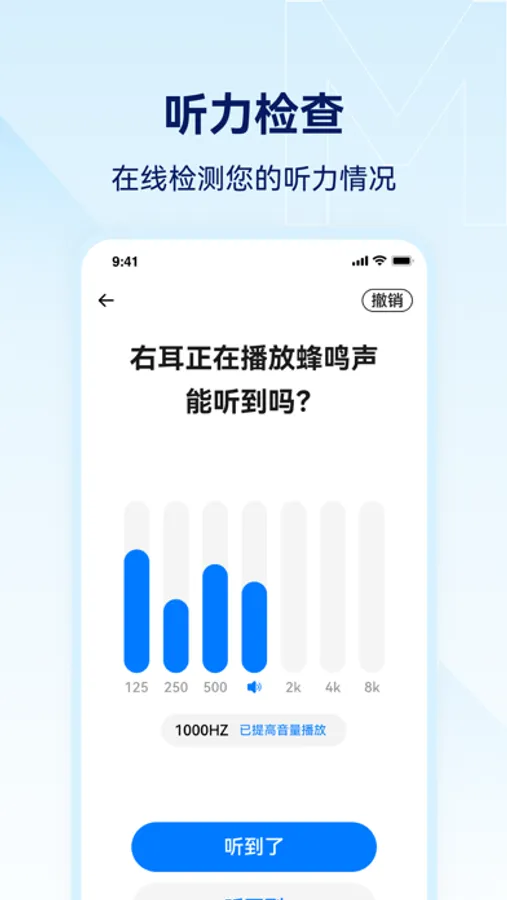测听:通过纯音测试,给左右耳播放不同频段,帮助听损患者检测听力受损程度,并提供专业定制方案;