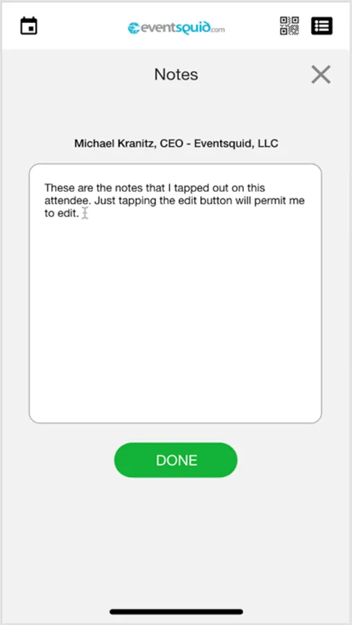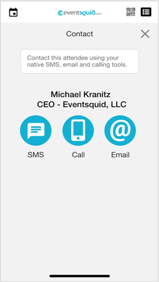 Attendees at events hosted on the Eventsquid system can scan attendee QR codes to retrieve contact data for the scanned attendee.