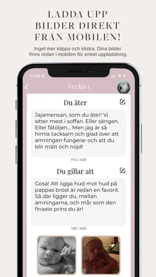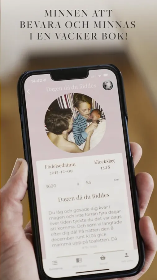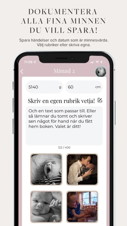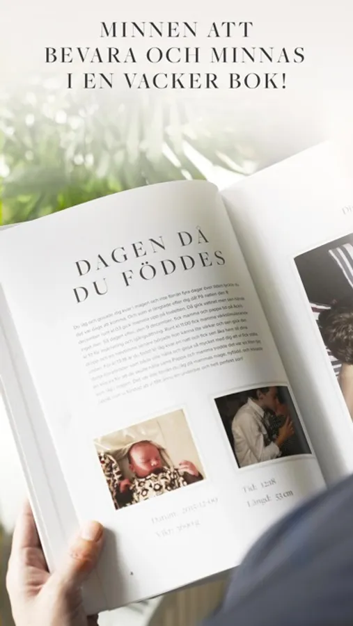 Istället för att du ska göra allt det där, som dessutom tar enormt mycket tid och engagemang, gör appen jobbet åt dig! När allt är ifylld och klart, lägger du din beställning och får hem en komplett bok i brevlådan. Alla moment är digitala, från uppladdning av foton, till dokumentation av vikt och längd, händelser, milstolpar, förlossningsberättelse och släktträd. Så här har du en riktig tids- och dåligt samvetebesparare!