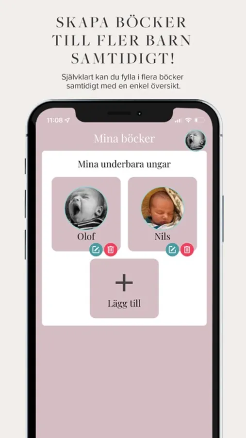 Du kan skapa flera böcker samtidigt. Om barnet är under 1 år, kan du använda appen och skapa boken i realtid. Då får du notiser för att komma ihåg att fota och dokumentera allt som händer. Om barnet är äldre än 1 år, kan du enkelt använda och skapa boken i efterhand. Det enda som skiljer sig åt är att du inte får notiser. Annars är allt lika.