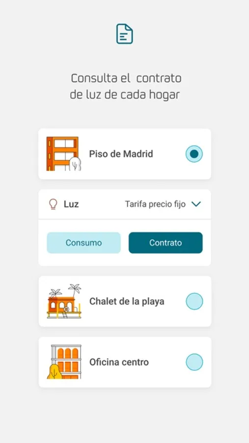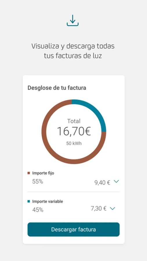 Te ayudamos a entender tus facturas de luz de forma sencilla: detallando el importe abonado de la parte variable, que depende de la energía que consumes; y el importe fijo, que corresponde a la potencia que tengas contratada, alquiler del contador y otros impuestos. Además, si aún no tienes domiciliado el pago de las facturas, podrás pagarlas usando la app mediante tarjeta bancaria.