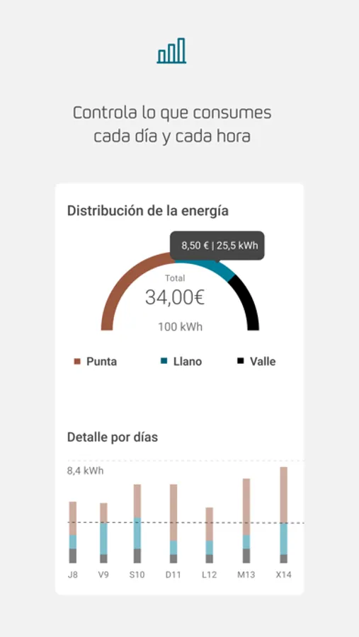 o Accede a tu consumo de luz en euros por día y horas, sin esperar a tu factura.