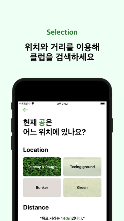 - You can select the location in which the golf ball is located (Teeing ground, Bunker, Fairway & Rough, Green).