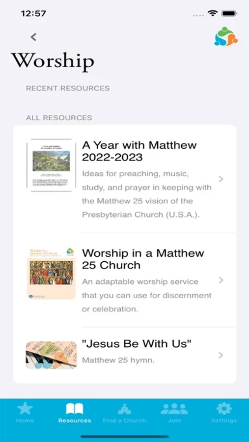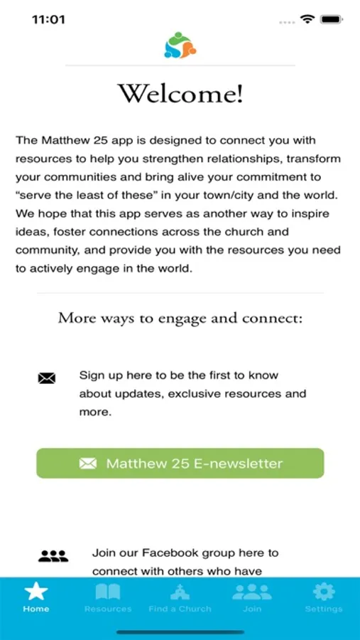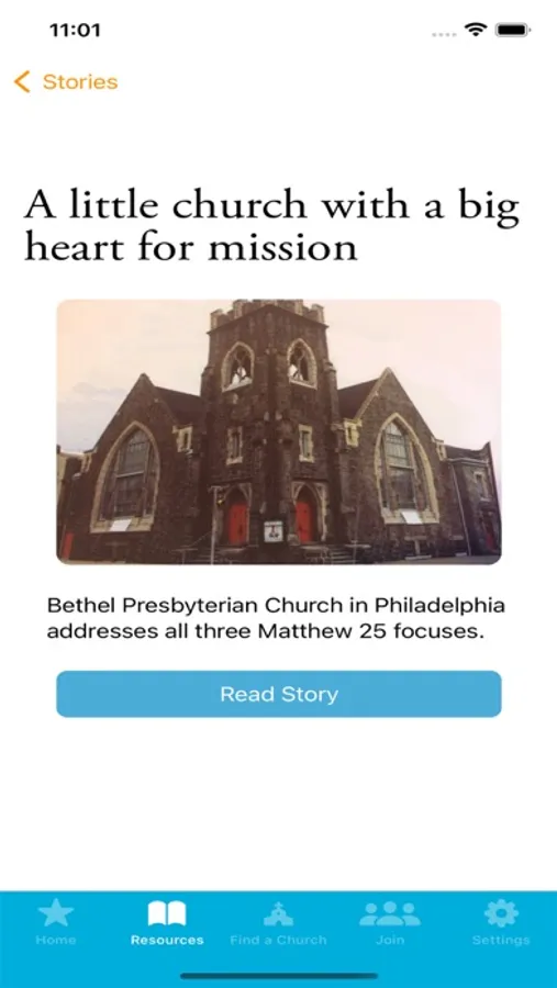 Join: Join the Matthew 25 journey with us. This section of the app guides you through the process of becoming a Matthew 25 church, mid-council, or organization.