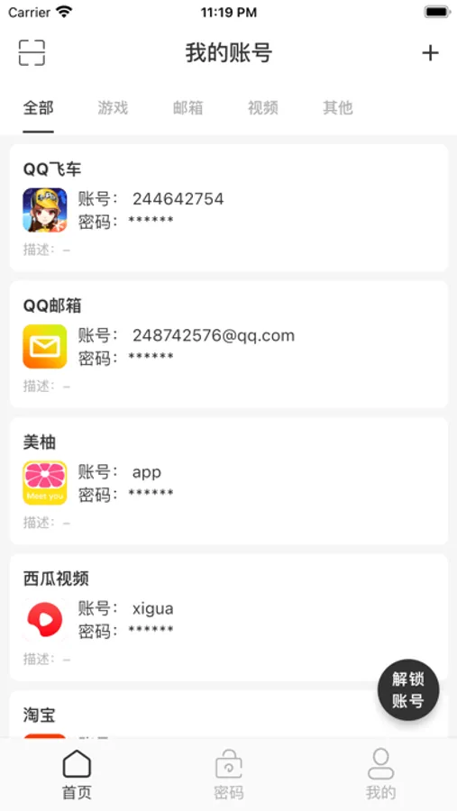 本应用是一款简单实用的账户密码管理软件,具备指纹、人脸、密码功能,避免账户泄漏,功能强大,页面简洁,随时记录,随时查看,是一款很不错的密码管理小帮手!