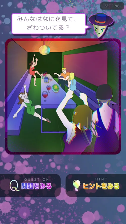 案内役の仮面人間「マスクマン」が進行していくバチェラーパーティ。