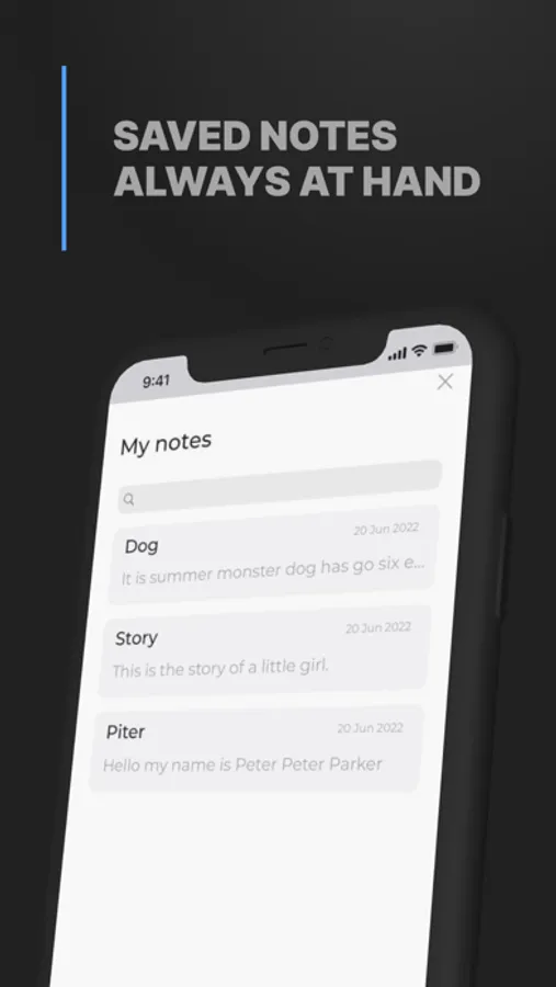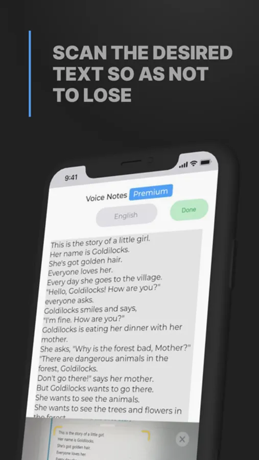 Voice Notes are not only talking and writing text on the phone screen. We have a unique option: Scan text, edit and save to notes, and play back your notes in the language in which they are written