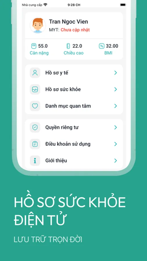 - Theo dõi thông tin sức khỏe (BMI, Tiền sử bệnh, dị ứng, lịch sử khám chữa bệnh… )
